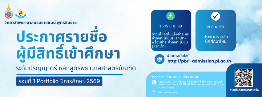 | ประกาศสถาบันพระบรมราชชนก เรื่อง รายชื่อผู้ผ่านการคัดเลือก (เพิ่มเติมกรณีผ่านผลตรวจร่างกาย) ระดับปริญญาตรี รอบที่ 1 Portfolio ปีการศึกษา 2568 คณะพยาบาลศาสตร์ หลักสูตรพยาบาลศาสตรบัณฑิต |