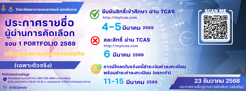 | ประกาศวิทยาลัยพยาบาลบรมราชชนนี พุทธชิยราช เรื่อง ขอเชิญบุคลากรในสังกัดสมัครเข้าร่วมอบรมโครงการประจำปี 2569 โครงการหลักสูตรฝึกอบรมการพยาบาลเฉพาะทางสาขาการพยาบาลเวชปฏิบัติทั่วไป (การรักษาโรคเบื้องต้น) รุ่นที่ 23 |